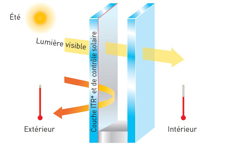Le vitrage à protection solaire a pour fonction de minimiser les apports en énergie solaire en période estivale.